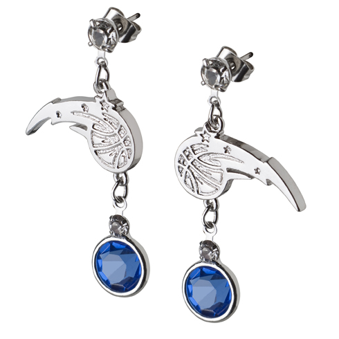 Orlando Magic crystal team logo dangle earrings are made of rhodium-plated mixed metal. Earrings length: 1 1/2in. The white crystals are 1/8in and the blue crystal is 5/16in in diameter. This official product is fully licensed and made using intricate metal molds and injected patterns for amazing detail.