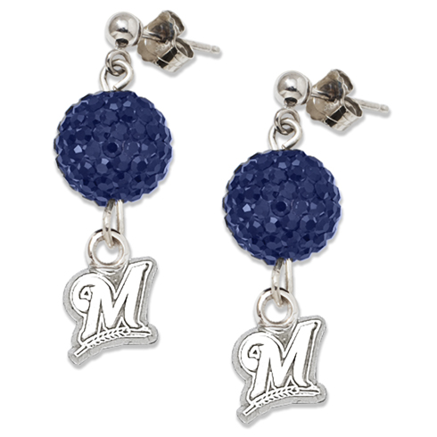 Milwaukee Brewers crystal ovation earrings are expertly crafted in solid sterling silver and richly plated in a rhodium finish. A Milwaukee Brewers charm dangles from a sphere glistening with an array of blue pavé crystals. Ball post earrings with push backs. Length: 1 1/4in. Width: 1/2in. Depth: 3/8in. Weight: 4.14 grams.