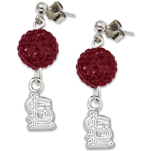 St. Louis Cardinals crystal ovation earrings are crafted in sterling silver with rhodium finish. A team logo charm dangles from a sphere glistening with an array of red pavé crystals. Ball post earrings with push backs. Length: 1 1/4in. Width: 1/2in. Depth: 3/8in. Weight: 4.14 grams.