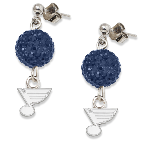 St Louis Blues crystal ovation earrings are made of polished sterling silver. St Louis Blues team logo charm is expertly crafted in solid sterling silver and richly plated in a rhodium finish, dangles from a sphere glistening with an array of pavé crystals that match your team's colors. Ball post earrings with push backs. Length: 1 1/4in. Width: 1/2in. Depth: 3/8in. Weight: 4.14 grams.