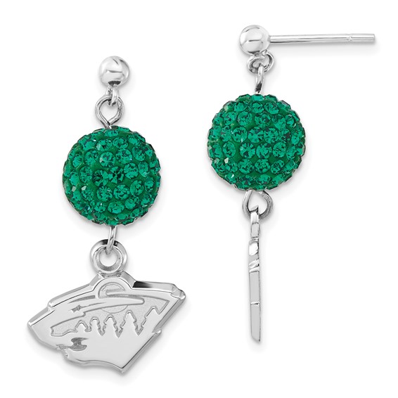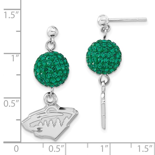Minnesota Wild crystal ovation earrings are expertly crafted in solid sterling silver and richly plated in a rhodium finish. San Minnesota Wild mascot charm dangles from a sphere glistening with green pavé crystals. Ball post earrings with push backs. Length: 1 1/4in. Width: 1/2in. Depth: 3/8in. Weight: 4.14 grams.