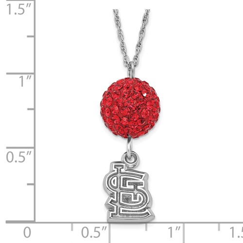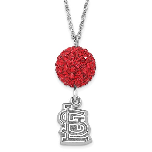 A sterling silver St. Louis Cardinals logo pendant dangles from a sphere glistening with pavé red crystals. 18in sterling silver loose rope chain. Officially licensed. Import.
