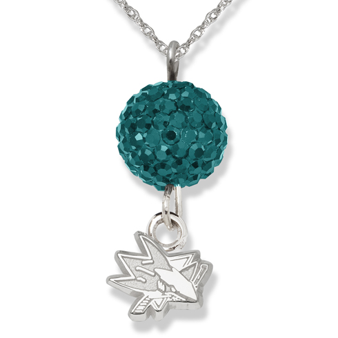 A sterling silver San Jose Sharks logo charm dangles from a sphere glistening with teal pavé crystals. 18in sterling silver chain. The San Jose Sharks crystal ovation necklace is crafted in solid sterling silver and richly plated in a rhodium finish. Pendant measures 1 1/8in by 1/2in. Import.