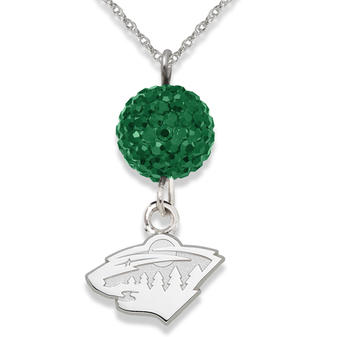 A sterling silver Minnesota Wild logo charm dangles from a sphere covered with green pavé crystals. 18in sterling silver chain. The Minnesota Wild crystal ovation necklace is crafted in solid sterling silver and richly plated in a rhodium finish. Pendant measures 1 1/8in by 1/2in. Import.