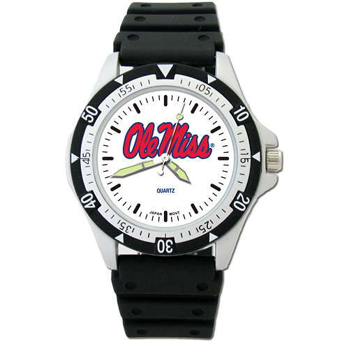 The Ole Miss option watch cwatch has a round white dial and black rubber strap. Plastic resin case and rotating bezel. Case is 1 1/2in wide, dial diameter 1in. The 8in coordinating strap is made from polyurethane. Team logo is shown boldly in the center of the watch. The Option Watch model features precision Citizen movement, and has hour, minute and second hands. Water resistant. Packaged in an attractive case. Two year limited warranty.