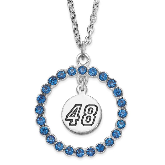 There is no mistaking your pride when you wear this Jimmie Johnson #48 Spirit Pendant Necklace! A silver-tone charm is deeply engraved with the logo of your favorite driver and strikingly enameled in black to stand out. A circle surrounds the charm which is studded with your driver's color in crystals! Item dimensions: 29mm x 3mm. 18in silver-tone chain with lobster clasp.
