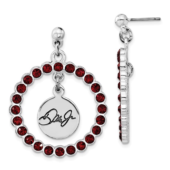 Dale Earnhardt Jr spirit crystal earrings have a silver-tone signature charm enameled in black. A wreath studded with red crystals surrounds the charm. Item dimensions: 1 1/4in x 1 1/4in. Polished and textured finish. Bullet backs. Shipped in an open view presentation box. Import.