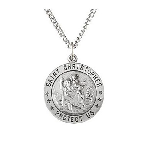 Polished sterling silver. SAINT CHRISTOPHER PROTECT US. Dimensions: 22mm in diameter. This item is slightly smaller than a quarter. The jump ring measures 2.1x2.25mm. Weighs 3.53 grams. Please note: weight is approximate, actual weight may vary. Comes with a 24 inch chain.