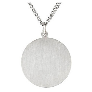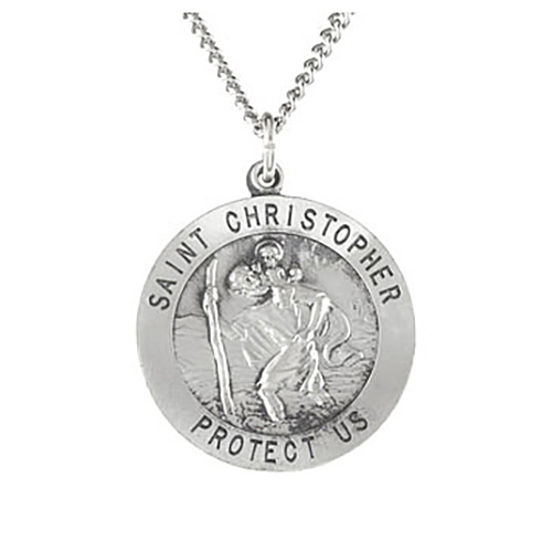 This men's large round Saint Christopher medal necklace is made of sterling silver. Dimensions: 33mm in diameter. This item is slightly larger than a half dollar. Medal dangles from a sterling silver 24 inch endless curb chain. Inscription: SAINT CHRISTOPHER PROTECT US. Weighs 16.3 grams. Please note: weight is approximate, actual weight may vary.