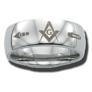 Stainless steel masonic ring features laser engraved square and compass, plumb bob and trowel emblems. high polish finish. 8mm wide. Available in sizes 7 1/2 to 13, whole and half sizes. Import.
