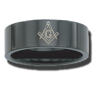 Black-plated stainless steel masonic ring features a laser engraved compasses and square emblem. Ring width: 8mm. Available in sizes 7 1/2 to 13, whole and half sizes. Import.