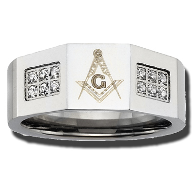Solid stainless steel masonic ring has a high polished finish and crystals. 10mm wide. Laser engraved compass and square emblem. Available in sizes 8 to 13, whole sizes only. Import.
