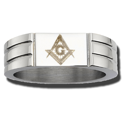 This stainless steel masonic ring features two grooves and a laser engraved set square and compasses emblem. Ring width: 8mm. Available in sizes 8 to 13, whole and half sizes. Import.