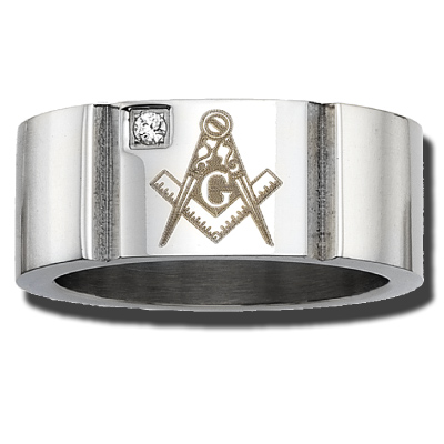 This wide stainless steel masonic ring features a round crystal accent and laser engraved square and compass emblem. 10mm wide. Available in sizes 8 to 13, whole sizes only. Import.