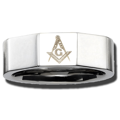 Stainless steel masonic ring has a flat top with laser engraved square and compass emblem. Ring width: 8mm. Available in sizes 8 to 13, whole and half sizes. Import.