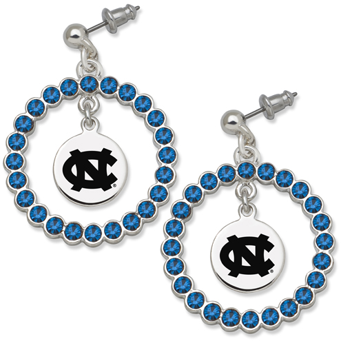 University of North Carolina spirit crystal earrings have a silver-tone school logo charm enameled in black. A wreath studded with blue crystals surrounds the charm. Item dimensions: 1 1/4in x 1 1/4in. Polished and textured finish. Bullet backs. Shipped in an open view presentation box. Import.