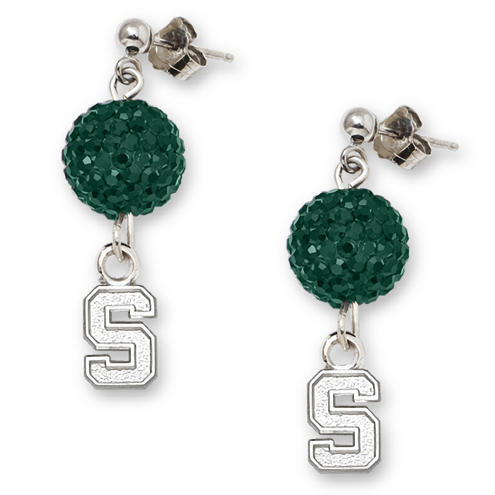Michigan State University crystal ovation earrings are expertly crafted in solid sterling silver and richly plated in a rhodium finish. Michigan State University block S charm dangles from a sphere glistening with an array of green pavé crystals. Ball post earrings with push backs. Length: 1 1/4in. Width: 1/2in. Depth: 3/8in. Weight: 4.14 grams.