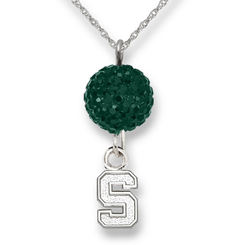 Michigian State University S logo charm necklace is made of sterling silver and plated in a rhodium finish. It dangles from a sphere glistening with pavé green crystals. 18in sterling silver loose rope chain.