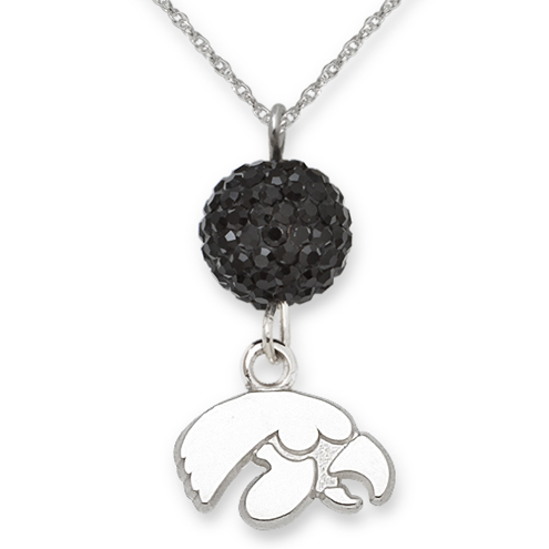 University of Iowa logo charm pendant is made of sterling silver and plated in a rhodium finish. It dangles from a sphere glistening with pavé black crystals. 18in sterling silver loose rope chain.