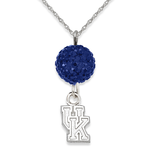 University of Kentucky logo charm pendant is made of sterling silver and plated in a rhodium finish. It dangles from a sphere glistening with pavé blue crystals. 18in sterling silver loose rope chain.
