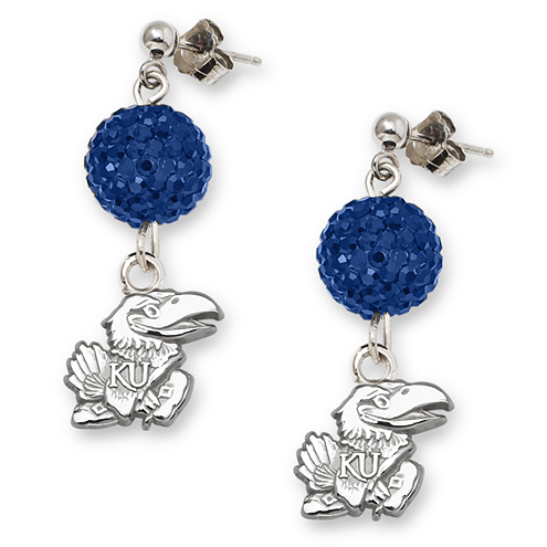 University of Kansas crystal ovation earrings are expertly crafted in solid sterling silver and richly plated in a rhodium finish. University of Kansas mascot charm dangles from a sphere glistening with an array of blue pavé crystals. Ball post earrings with push backs. Length: 1 1/4in. Width: 1/2in. Depth: 3/8in. Weight: 4.14 grams.