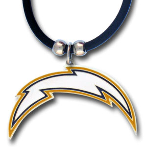 There is no mistaking your support for your San Diego Chargers when you wear this officially licensed NFL enamel necklace. NFL logo pendant strung on rubber cord. Pendant size: 3in x 2in. Features an easy to open/close clasp on a 22in rubber cord necklace.