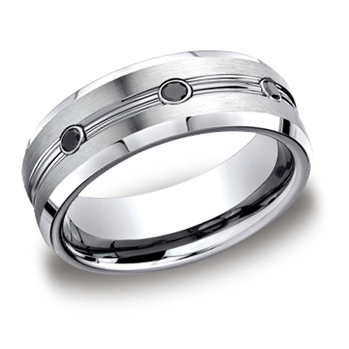 Satin finish 7.5mm cobalt wedding band has high-polish beveled edges and a center cut between three round ideal-cut black diamonds. Total diamond carat weight is .20ct. Comfort fit. Made in the USA.4x harder than Platinum, 5x harder than Gold and 7x harder than Silver: Cobalt is the ultimate contemporary metal. This rings naturally inert Cobalt contains a special blend of Cobalt and other alloys that exude extremely high luster and reliable strength. Because it is also hypoallergenic, scratch resistant and biocompatible, it has been used heavily in medical applications. Cobalt, unlike Tungsten, is shatter proof.