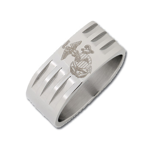 Solid stainless steel ring with high polish bright finish. Eagle, globe and anchor logo. 8mm wide. Available in sizes 8 to 13 1/2, whole and half sizes. Import.
