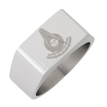 Wide stainless steel masonic ring has a flat top and laser engraved past master mason emblem. Ring width: 10mm. Available in sizes 8 to 13, whole and half sizes. Import.