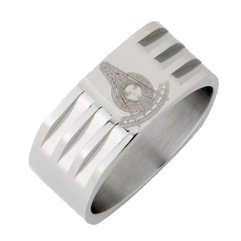 This stainless steel masonic ring features distinctive grooves and a laser engraved past master mason emblem. Ring width: 8mm. Available in sizes 8 to 13, whole and half sizes. Import.