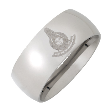 Stainless steel past master mason ring has a domed center and laser engraved past master emblem. Ring width: 8mm. Available in sizes 8 to 13, whole and half sizes. Import.