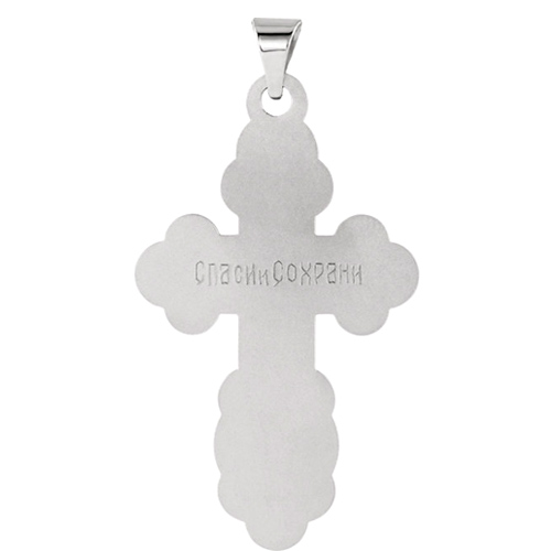 This ladies' Russian orthodox cross pendant is made of solid 14k white gold. Polished finish. Dimensions: 19mm x 13mm. Protect and Save is inscribed on the back in Russian. Pendant approximate weight: 1.21 grams.