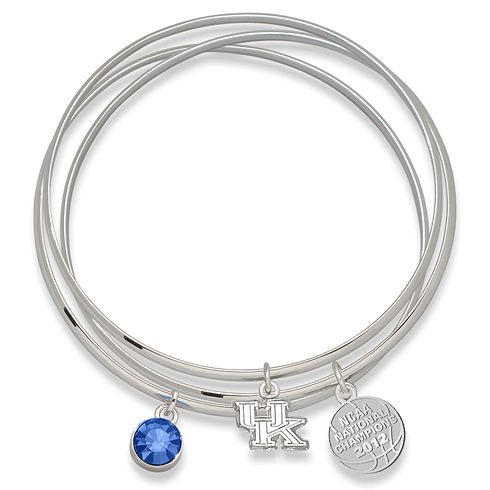 Pay tribute to the University of Kentucky with the triple bangle bracelet commemorating their 2012 NCAA Basketball championship. Sleek in styling, each bangle represents an aspect of the winning team. With the University of Kentucky's icon dangling on one bangle, the second has a Preciosa crystal matching their school color, and finally the third bangle recognizes them as the NCAA Basketball champions with an official 2012 NCAA Basketball Champion charm. Weight: 28 grams. Measures 2 3/4 inches wide.