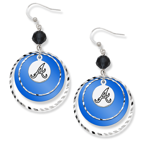These Atlanta Braves dangle earrings boast your team's color with a colored glass bead right below the shepherds hook. Just below the glass bead, there are multiple silver tone textured round metal circles that hang on top of a team-colored Lucite disk. To make the earring complete, right in the middle of the action is a highly polished team logo charm deeply etched in bold black enamel.