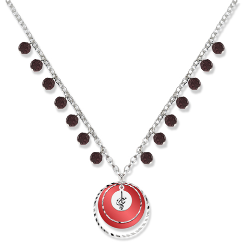 The Cleveland Cavailers Game Day necklace boasts your team's colors with 14 dangling colored glass beads on an 18in silver tone Rollo chain. The pendant has multiple silver tone textured round metal circles that hang on top of a team-colored Lucite disk. Right in the middle of the action is a highly polished team logo charm deeply etched in bold black enamel. The chain features a secure lobster clasp and has a three inch extender chain.