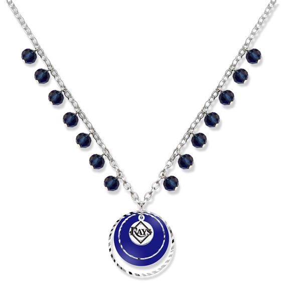 The Tampa Bay Rays Game Day necklace boasts your team's colors with 14 dangling colored glass beads on an 18in silver tone Rollo chain. The pendant has multiple silver tone textured round metal circles that hang on top of a team-colored Lucite disk. Right in the middle of the action is a highly polished team logo charm deeply etched in bold black enamel. The chain features a secure lobster clasp and has a three inch extender chain.