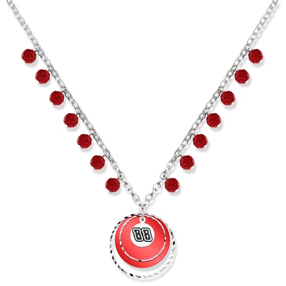 The Dale Jr. Game Day necklace boasts your team's colors with 14 dangling colored glass beads on an 18in silver tone Rollo chain. The pendant has multiple silver tone textured round metal circles that hang on top of a team-colored Lucite disk. Right in the middle of the action is a highly polished team logo charm deeply etched in bold black enamel. The chain features a secure lobster clasp and has a three inch extender chain.