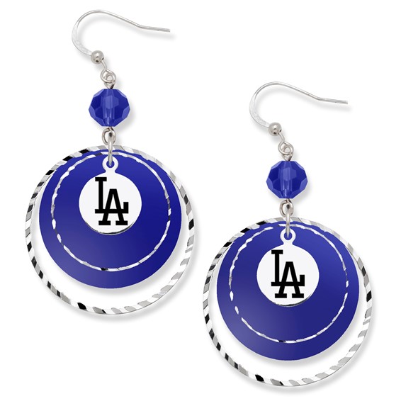 These Los Angeles Dodgers dangle earrings boast your team's color with a colored glass bead right below the Sheppard's hook. Just below the glass bead, there are multiple silver tone textured round metal circles that hang on top of a team-colored Lucite disk. To make the earring complete, right in the middle of the action is a highly polished team logo charm deeply etched in bold black enamel.