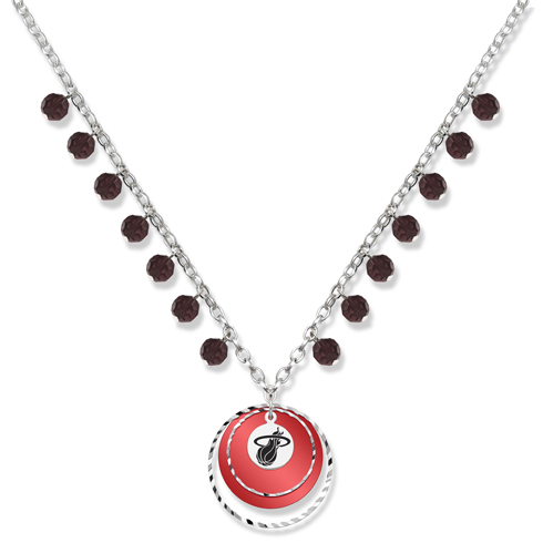 The Miami Heat game day necklace boasts team colors with 14 dangling colored glass beads on an 18in silver tone rollo chain. The pendant has multiple silver tone textured round metal circles that hang on top of a team-colored Lucite disk. Right in the middle of the action is a highly polished team logo charm deeply etched in bold black enamel. The chain features a secure lobster clasp and has a three inch extender chain.
