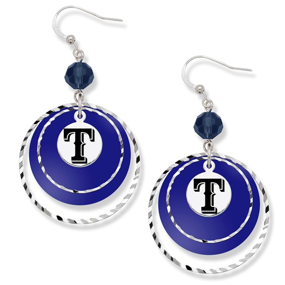 These Texas Rangers dangle earrings boast your team's color with a colored glass bead right below the Sheppard's hook. Just below the glass bead, there are multiple silver tone textured round metal circles that hang on top of a team-colored Lucite disk. To make the earring complete, right in the middle of the action is a highly polished team logo charm deeply etched in bold black enamel.