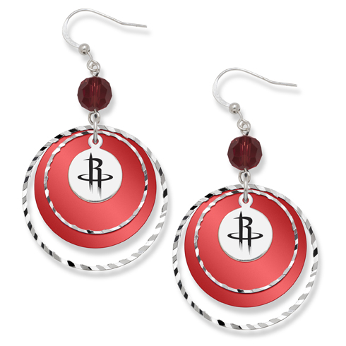 These Houston Rockets dangle earrings boast your team's color with a colored glass bead right below the shepherd hook. Just below the glass bead, there are multiple silver tone textured round metal circles that hang on top of a team-colored Lucite disk. To make the earring complete, right in the middle of the action is a highly polished team logo charm deeply etched in bold black enamel.