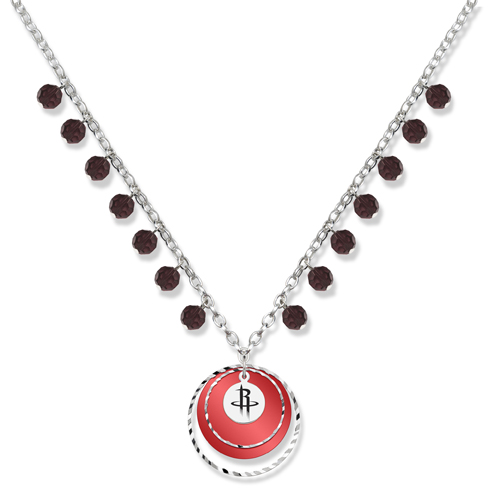 The Houston Rockets game day necklace boasts your team's colors with 14 dangling colored glass beads on an 18in silver tone Rollo chain. The pendant has multiple silver tone textured round metal circles that hang on top of a team-colored Lucite disk. Right in the middle of the action is a highly polished team logo charm deeply etched in bold black enamel. The chain features a secure lobster clasp and has a three inch extender chain.