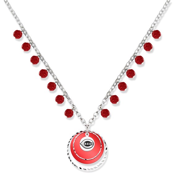 The Cincinnati Reds Game Day necklace boasts your team's colors with 14 dangling colored glass beads on an 18in silver tone Rollo chain. The pendant has multiple silver tone textured round metal circles that hang on top of a team-colored Lucite disk. Right in the middle of the action is a highly polished team logo charm deeply etched in bold black enamel. The chain features a secure lobster clasp and has a three inch extender chain.