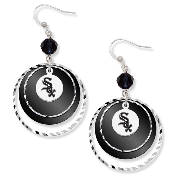 The Chicago White Sox dangle earrings boast your team's color with a colored glass bead right below the shepherds hook. Just below the glass bead, there are multiple silver tone textured round metal circles that hang on top of a team-colored Lucite disk. To make the earring complete, right in the middle of the action is a highly polished team logo charm deeply etched in bold black enamel.