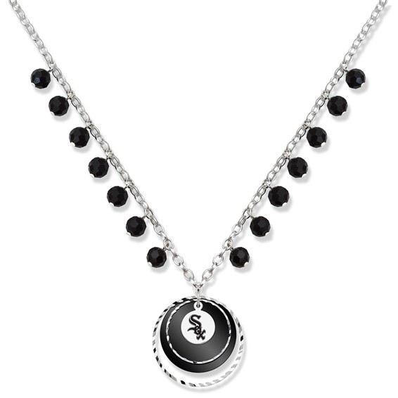 The Chicago White Sox Game Day necklace boasts your team's colors with 14 dangling colored glass beads on an 18in silver tone Rollo chain. The pendant has multiple silver tone textured round metal circles that hang on top of a team-colored Lucite disk. Right in the middle of the action is a highly polished team logo charm deeply etched in bold black enamel. The chain features a secure lobster clasp and has a three inch extender chain.