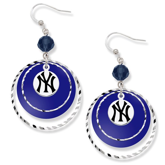 These New York Yankees dangle earrings boast your team's color with a colored glass bead right below the shepherds hook. Just below the glass bead, there are multiple silver tone textured round metal circles that hang on top of a team-colored Lucite disk. To make the earring complete, right in the middle of the action is a highly polished team logo charm deeply etched in bold black enamel.