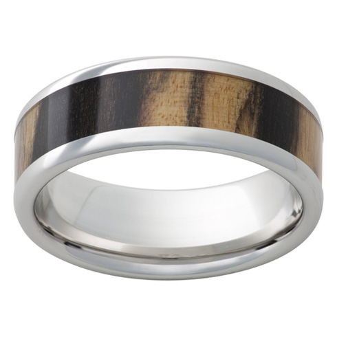 Cobalt chrome ring 8mm is set with a black and tan ebony wood inlay. The deluxe comfort ring is 8mm wide and the wood inlay is 5mm wide. Cobalt Chrome is a unique alloy blend that consists of cobalt and other substances to form a bright white alternative metal. It is as white as platinum, hypoallergenic, unbreakable, and scratch resistance. These bands are light-weight, inside round comfort fit and very comfortable to wear. This metal has been used in medical applications for years. Occasional polishing may be required.