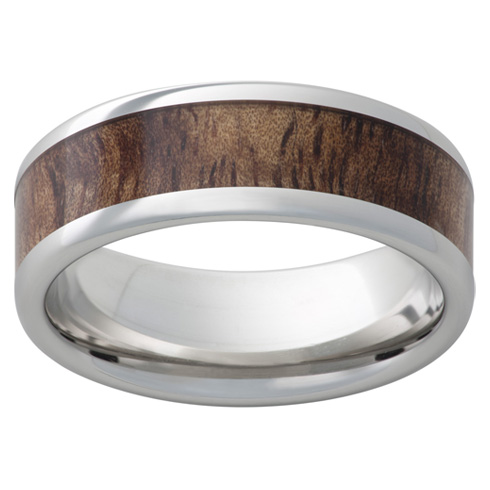 Cobalt chrome ring 8mm is set with a tiger koa wood inlay. The deluxe comfort ring is 8mm wide and the wood inlay is 5mm wide. Cobalt Chrome is a unique alloy blend that consists of cobalt and other substances to form a bright white alternative metal. It is as white as platinum, hypoallergenic, unbreakable, and scratch resistance. These bands are light-weight, inside round comfort fit and very comfortable to wear. This metal has been used in medical applications for years. Occasional polishing may be required.