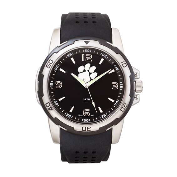 Clemson University stealth watch has a brushed chrome finish alloy case with black and chrome molded bezel. Soft silicone rubber strap with stainless steel buckle. Case is 3 ATM water resistant with stainless steel back. Non-reflective coated mineral glass crystal to enhance dial visibility. Japanese quartz movement and 3 luminous hands. Black dial ring with contrasting white 60 minute number track. Glossy black dial with polished raised team logo and hour marks. Dial diameter 1 3/16in, case width 1 15/16in by 2 1/8in height. Lifetime limited warranty on watch. Comes in gift box packaging.