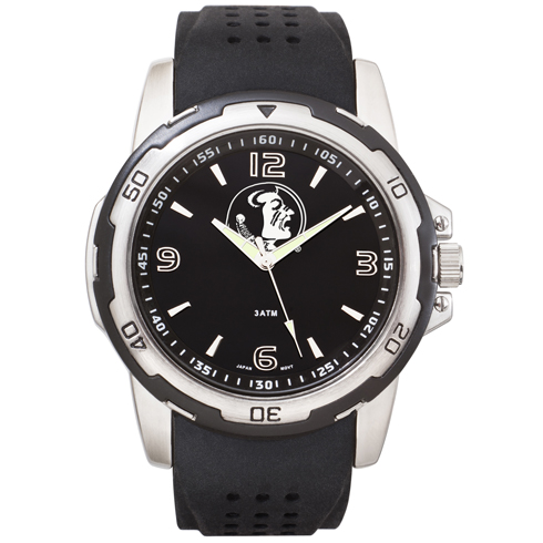 Florida State University men's stealth watch has a brushed chrome finish alloy case with black and chrome molded bezel. Soft silicone rubber strap with stainless steel buckle. Dial diameter 1 3/16in, case width 1 15/16in by 2 1/8in height. Case is 3 ATM water resistant with stainless steel back. Non-reflective coated mineral glass crystal to enhance dial visibility. Japanese quartz movement and 3 luminous hands. Black dial ring with contrasting white 60 minute number track. Glossy black dial with polished raised team logo and hour marks. Lifetime limited warranty on watch. Comes in gift box packaging.